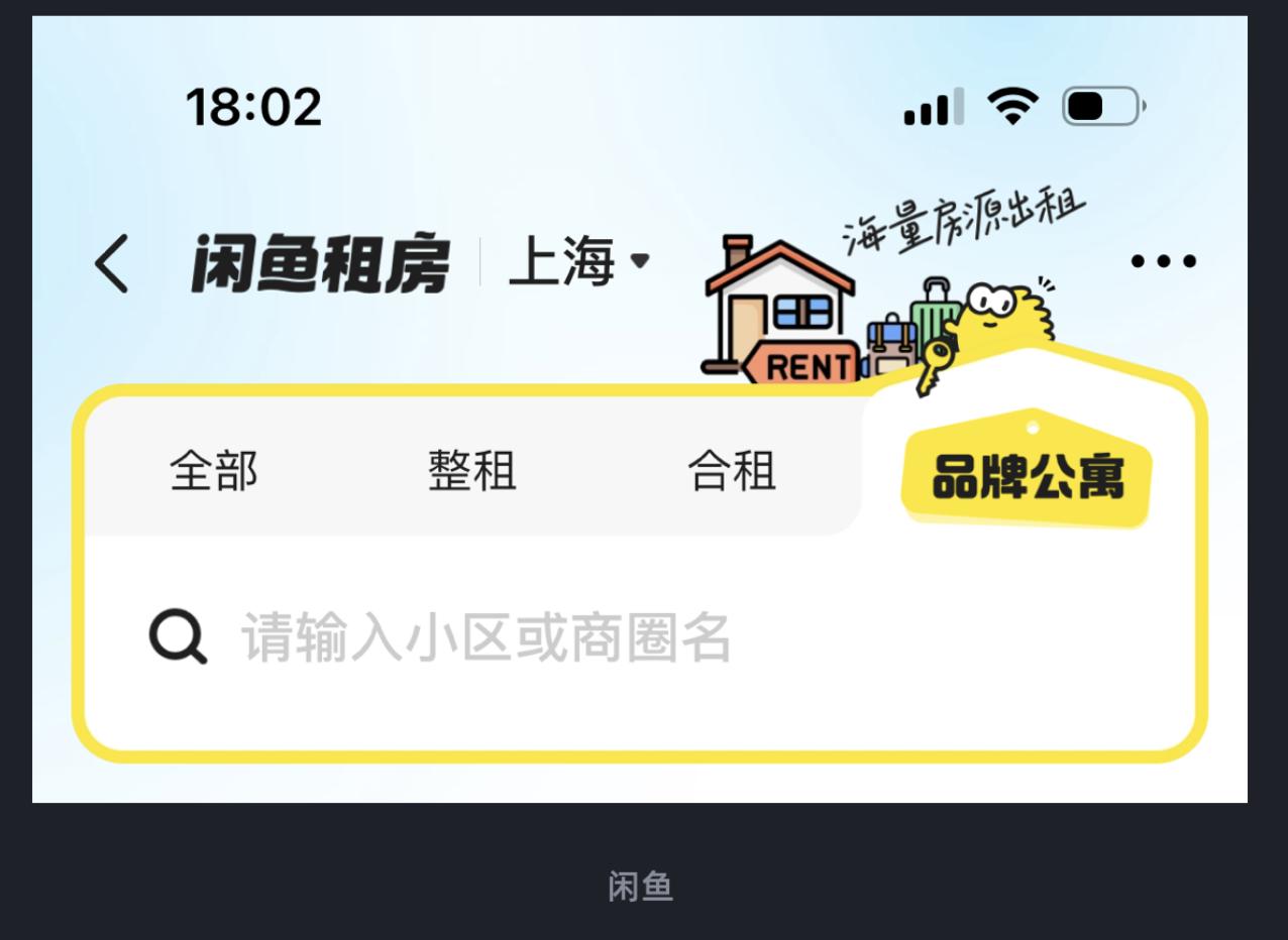 傳統(tǒng)租房板塊多以 “文字 + 普通卡片” 呈現(xiàn),用戶需先讀文字才能識(shí)別功能;閑魚則直接將 “房屋結(jié)構(gòu)” 轉(zhuǎn)化為視覺符號(hào) —— 卡片上用簡(jiǎn)化的房屋輪廓圖標(biāo)替代傳統(tǒng)標(biāo)簽,配合 “RENT” 英文標(biāo)識(shí),讓用戶一眼就能關(guān)聯(lián) “租房” 業(yè)務(wù)。這種設(shè)計(jì)不僅強(qiáng)化了業(yè)務(wù)屬性,還通過(guò)圖形化降低了信息識(shí)別成本,同時(shí)獨(dú)特的視覺符號(hào)也加深了用戶對(duì)產(chǎn)品的記憶度。
