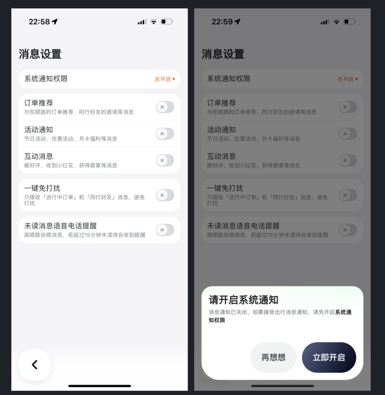 “引導(dǎo)用戶開啟系統(tǒng)通知” 是很多 APP 的剛需,但傳統(tǒng)設(shè)計(jì)多采用 “強(qiáng)硬引導(dǎo)”(如 “去開啟” 按鈕),忽略了用戶 “怕打擾” 的核心顧慮,反而導(dǎo)致用戶反感。嘀嗒出行的通知設(shè)置設(shè)計(jì),卻用 “一鍵免打擾” 的選項(xiàng),做到了 “產(chǎn)品需求” 與 “用戶體驗(yàn)” 的平衡。