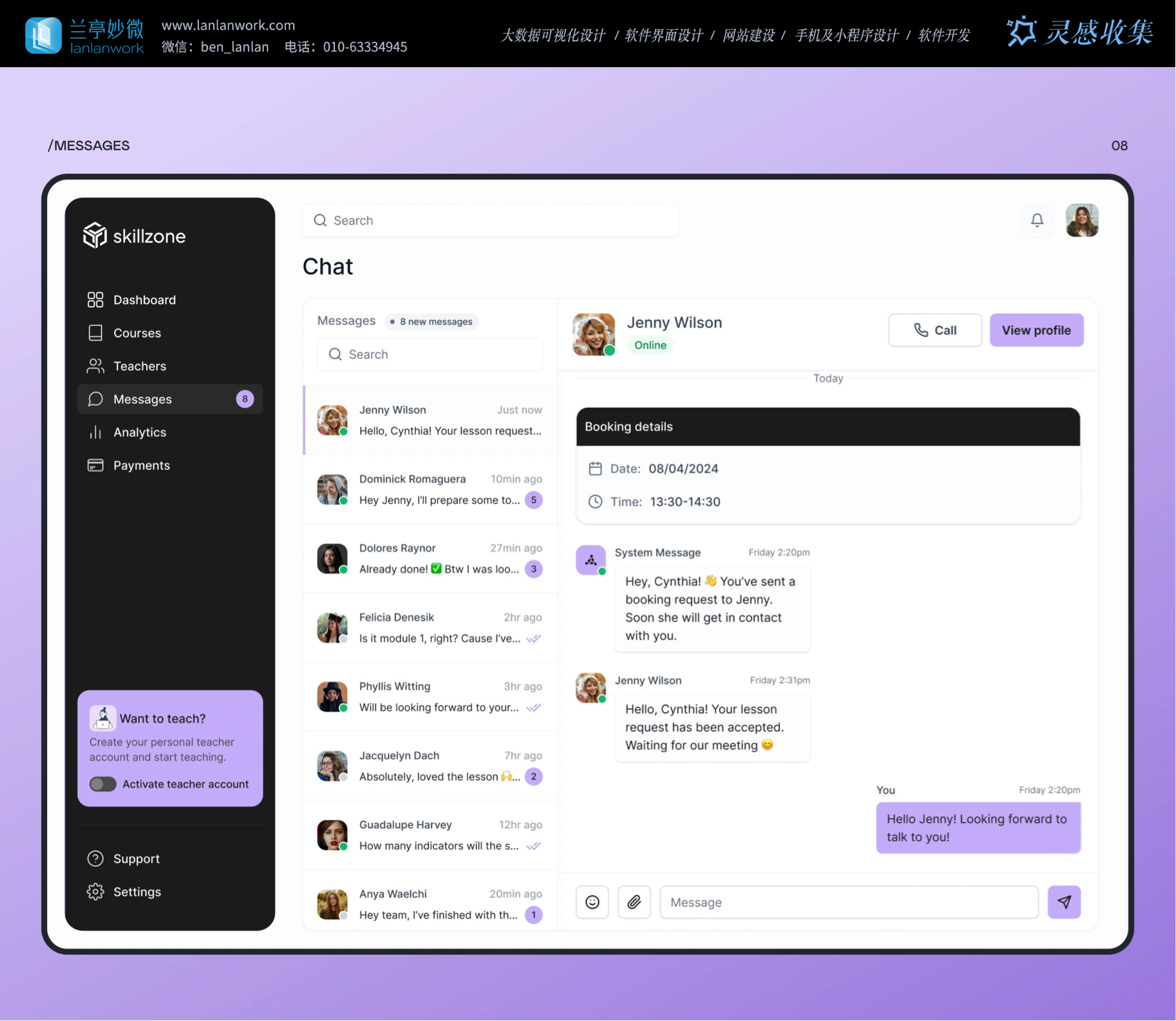 足多樣教學需求。消息模塊里,聊天界面實時顯示在線狀態(tài)、課程預約詳情,師生溝通方便又順暢。這些貼心設