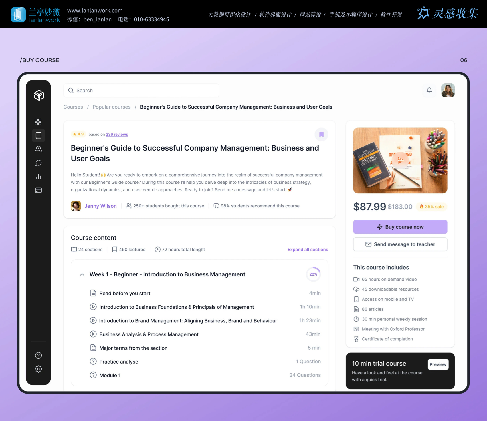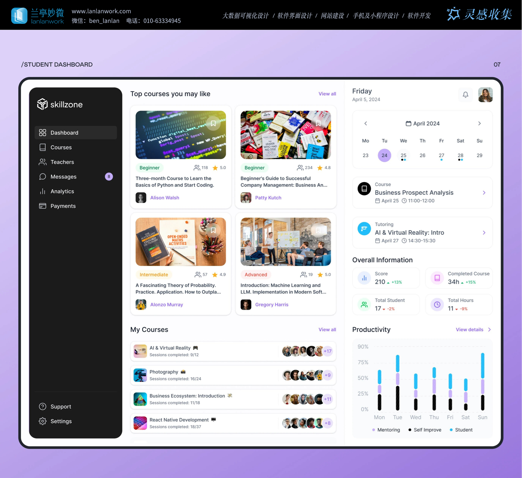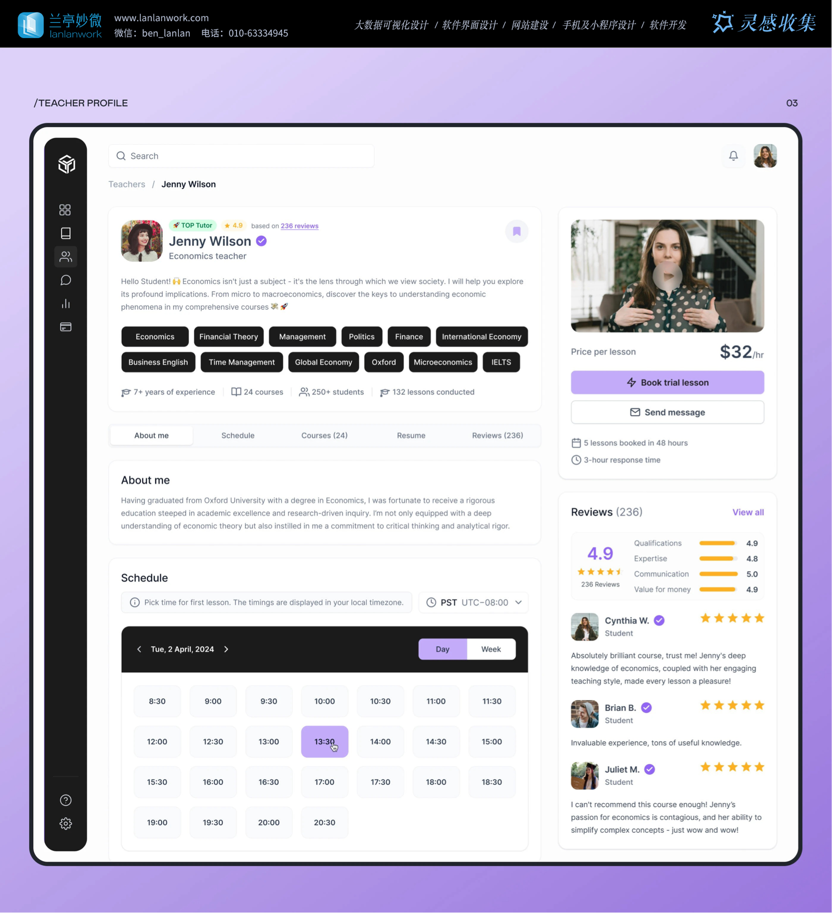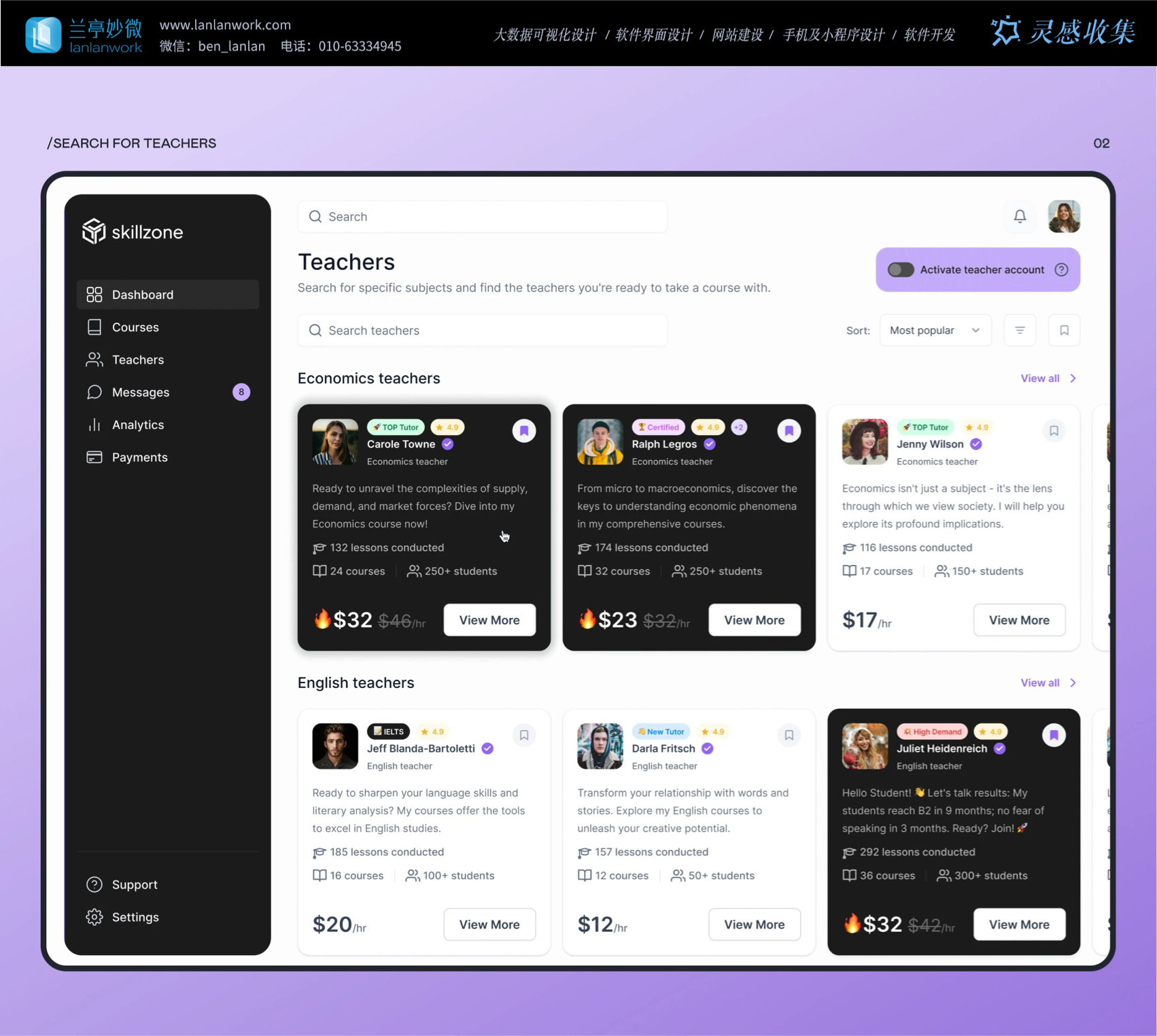 Skillzone 選用柔和的紫色為主色調,紫色常給人智慧、有創(chuàng)造力的的感覺,很符合教育的特點。再搭配簡潔的黑白