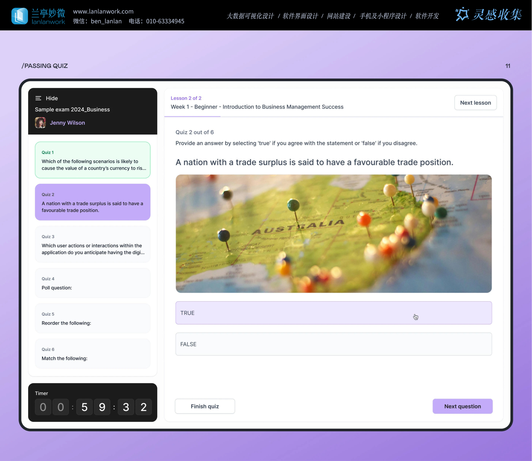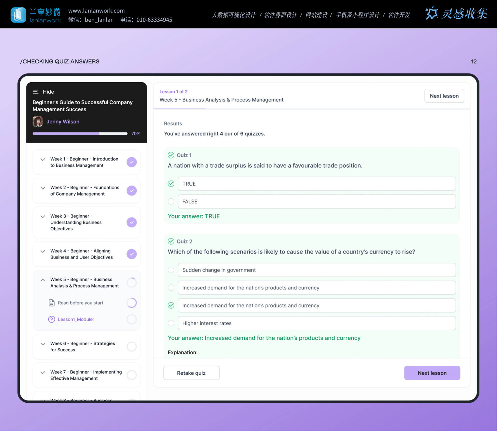 交互設計處處為用戶考慮。就說測驗功能,學生答題頁有 "Retakeequiz (重新測驗)""Next lesson (下一課)"