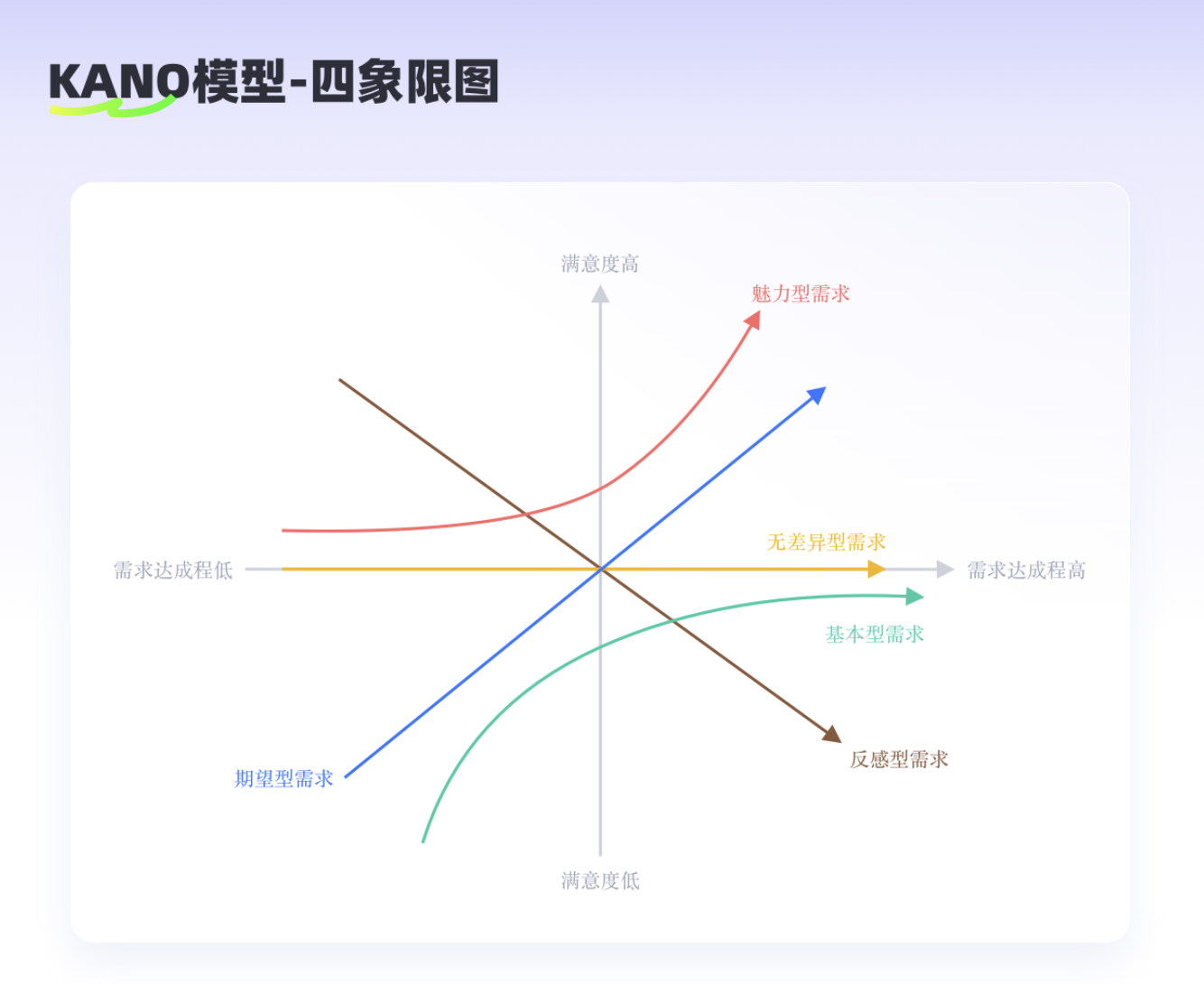 想做好愉悅感設計,首先要明白:不是所有功能都能帶來愉悅,只有找對 “用戶真正在意的需求”,才能避免 “費力不討好”。東京理工大學狩野紀昭教授提出的 Kano 模型,能幫我們理清需求的優(yōu)先級,找到愉悅感的發(fā)力點。