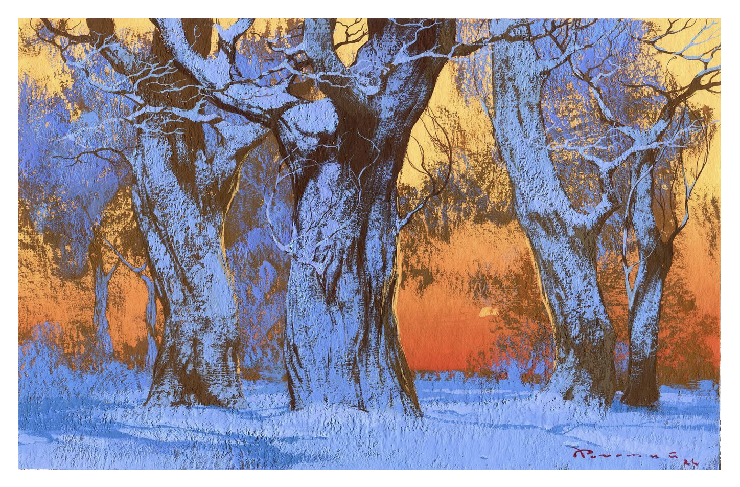 Artem Rohovyi 的創(chuàng)作核心,是對冬日枯樹的深度描摹。在他筆下,枯樹不再是生命凋零的象征,而是冬日浪漫的 “骨架”。