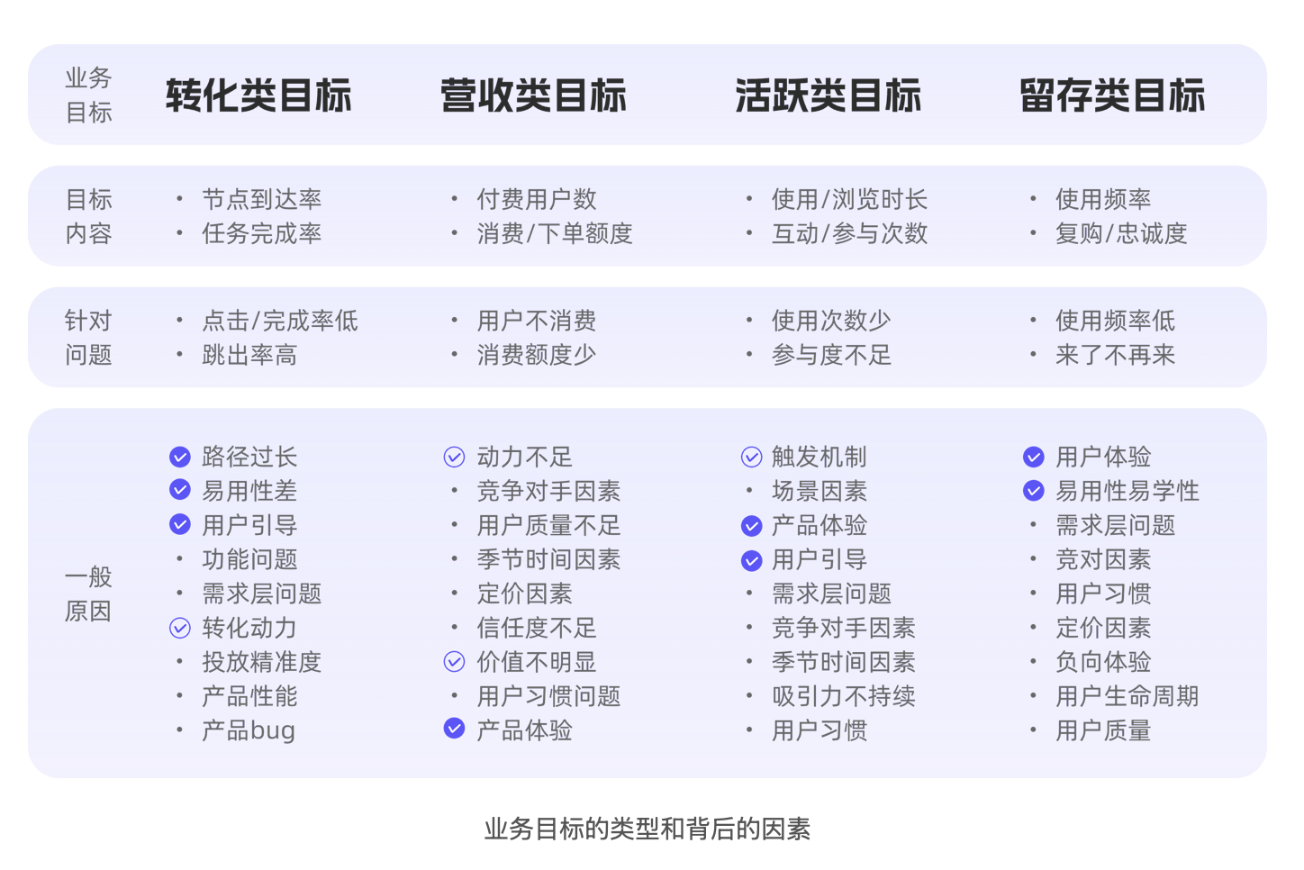 先判斷業(yè)務目標屬于哪一類,再定位核心痛點。四大類業(yè)務目標的核心問題的如下: