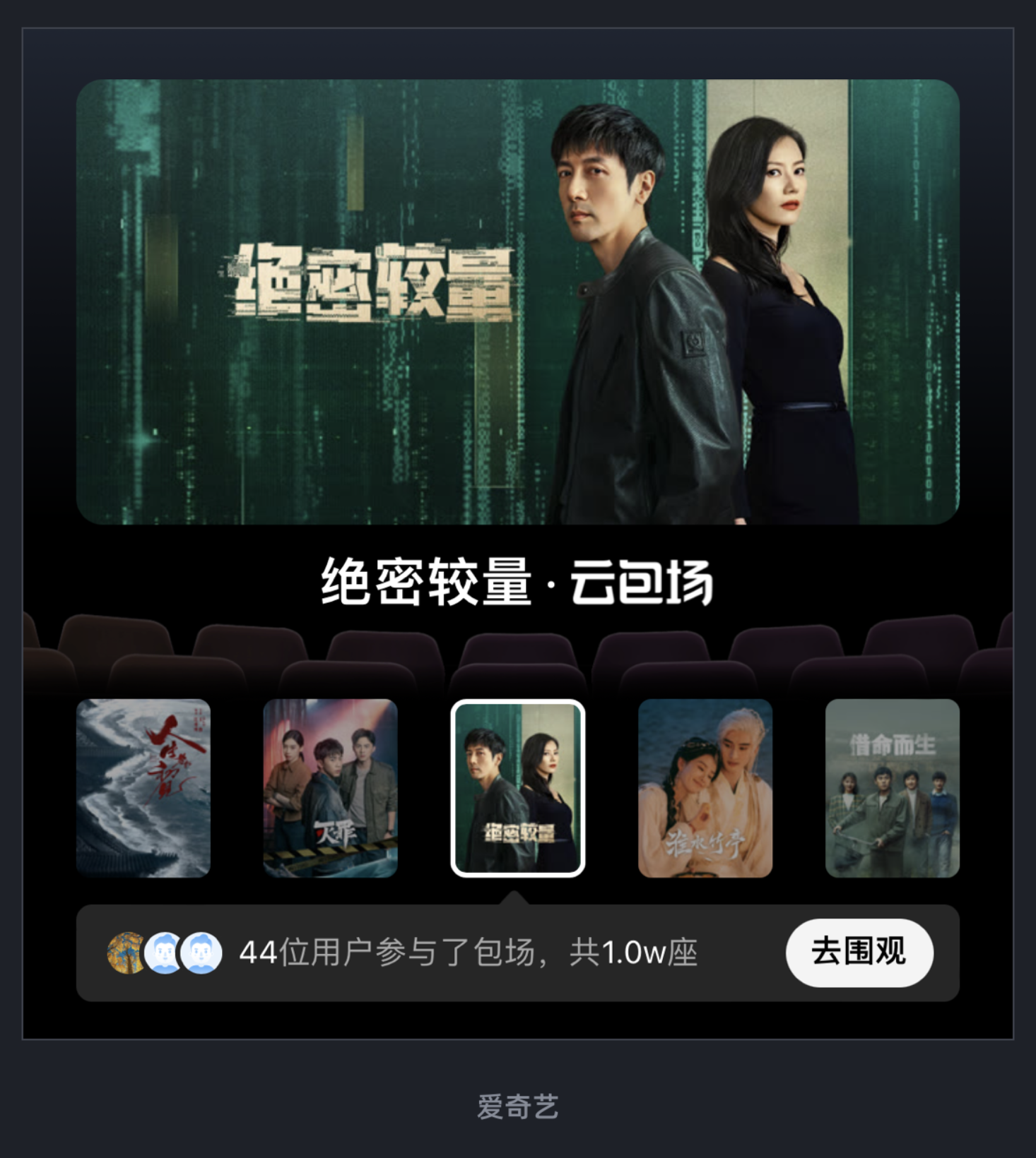 愛奇藝 “云包場(chǎng)” 欄目完美詮釋了這一點(diǎn):將影院觀影的場(chǎng)景搬到線上,通過模擬影廳座位、觀眾參與人數(shù)等元素,讓用戶感受到 “和陌生人一起看電影” 的氛圍感。這種設(shè)計(jì)不僅讓 “云包場(chǎng)” 功能更直觀,還提升了用戶的參與意愿,讓功能不再是冰冷的按鈕。