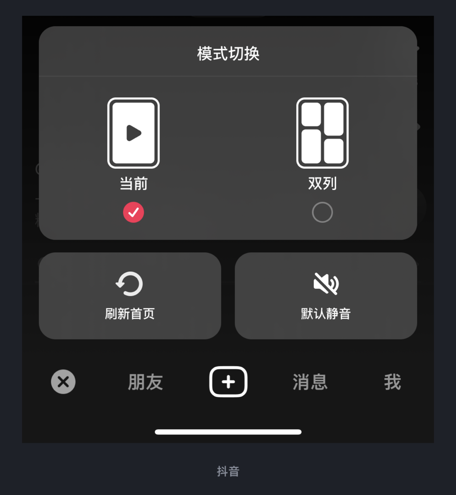 手勢(shì)交互的核心是 “用最自然的動(dòng)作實(shí)現(xiàn)最常用的功能”,而雙觸發(fā)手勢(shì)則讓單一入口承載更多可能性。抖音的底部 “首頁(yè)” 標(biāo)簽欄就藏著這樣的巧思:?jiǎn)螕艏纯煽焖偎⑿聝?nèi)容,長(zhǎng)按則彈出功能面板,支持單列 / 雙列布局切換、默認(rèn)靜音設(shè)置等操作。