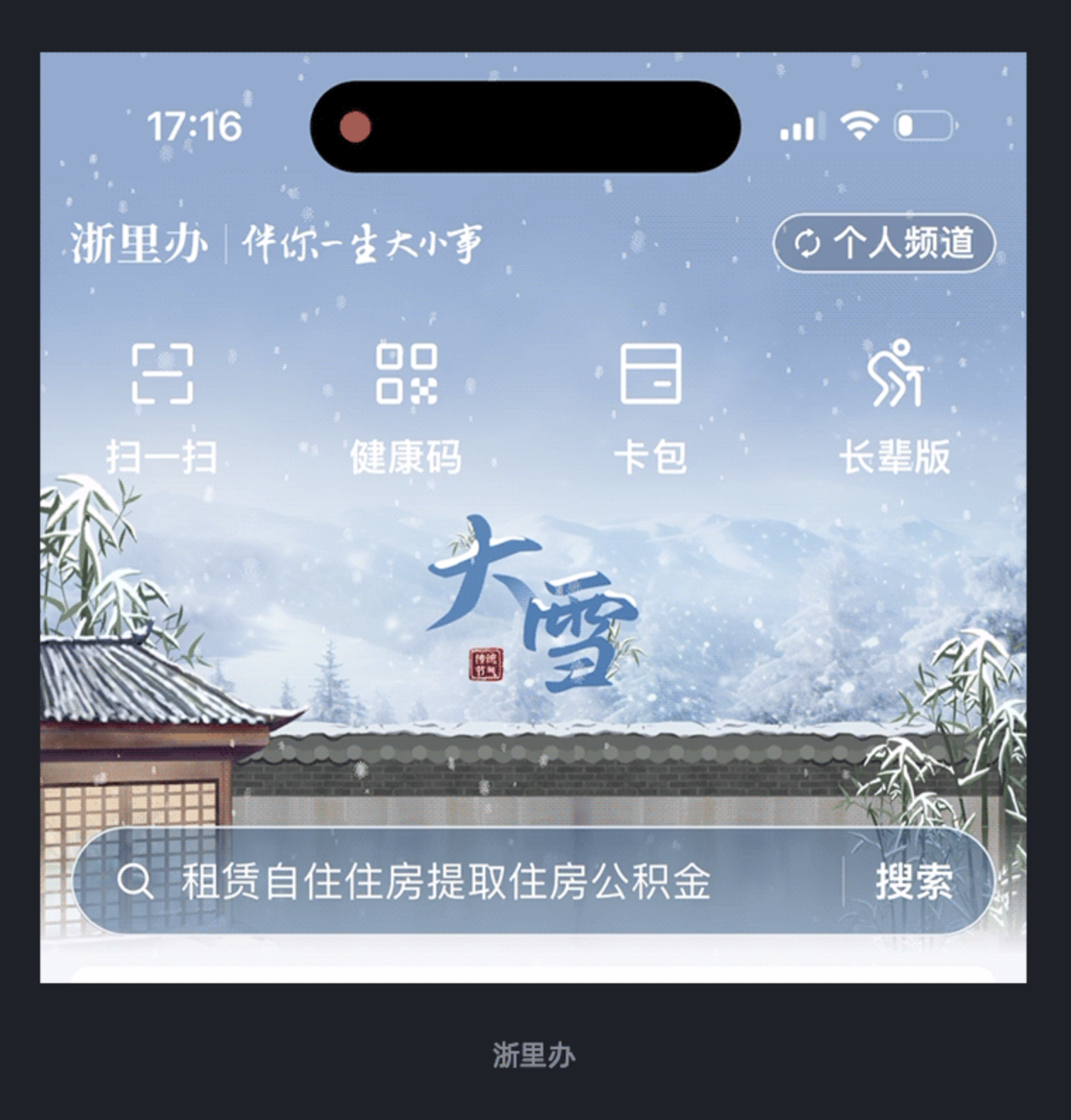 產(chǎn)品的溫度往往體現(xiàn)在場(chǎng)景化的細(xì)節(jié)中,應(yīng)景式背景設(shè)計(jì)能讓用戶在特定時(shí)刻感受到專屬關(guān)懷。政務(wù) App “浙里辦” 深諳此道,在春節(jié)、中秋等傳統(tǒng)節(jié)日,或是立春、冬至等節(jié)氣當(dāng)天,會(huì)同步更新頂部視覺區(qū)域的背景。