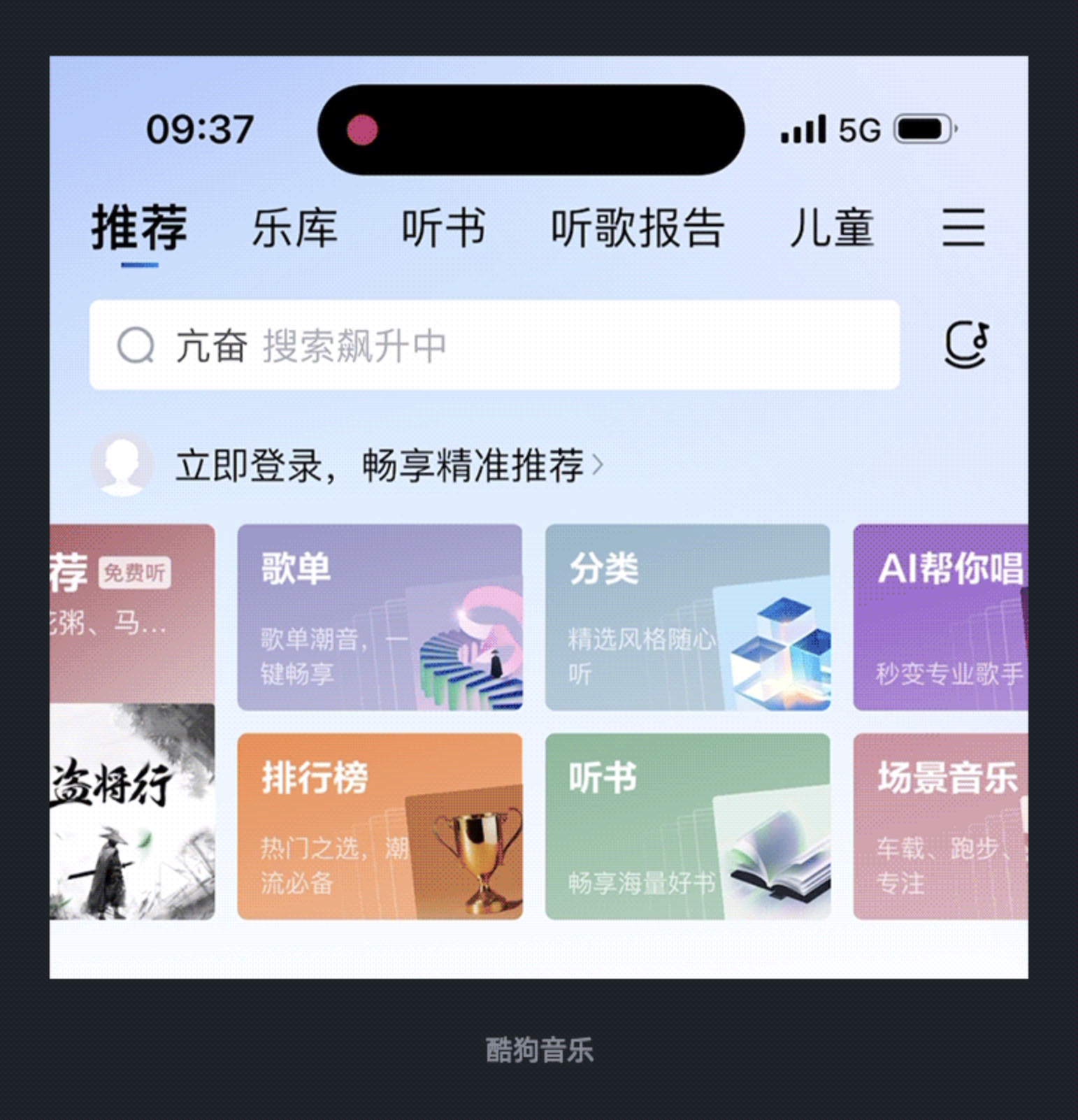 這種設(shè)計(jì)既保證了基礎(chǔ)框架的穩(wěn)定性,又能靈活填充不同類型的內(nèi)容 —— 無論是歌單推薦、歌手卡片還是活動(dòng)入口,都能自然融入布局。流暢的滑動(dòng)動(dòng)效的加持,讓交互過程更具絲滑感,避免了固定布局的僵硬與擁擠。