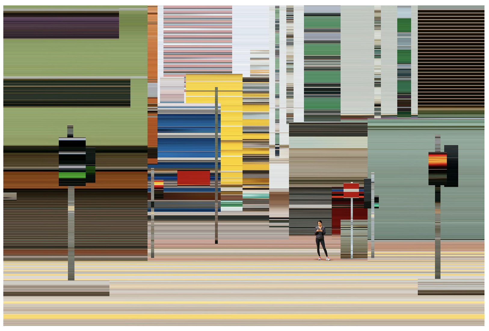 《時間拉伸》系列是一場關(guān)于感知邊界的探索,每一幅作品都構(gòu)建了一個超現(xiàn)實的視覺場域。藝術(shù)家以全球多個城市為拍攝背景,從繁華的都市街道到靜謐的自然角落,卻通過 “拉伸時間” 的創(chuàng)作手法,將周圍的環(huán)境拆解、扭曲、重組。畫面中,中央人物始終保持著清晰、穩(wěn)定的姿態(tài),仿佛被按下了暫停鍵,脫離了時間的洪流;而背景中的建筑、街道、光影則被無限拉長、模糊,化作流動的色彩與線條,如同被時間的浪潮沖刷過的痕跡。