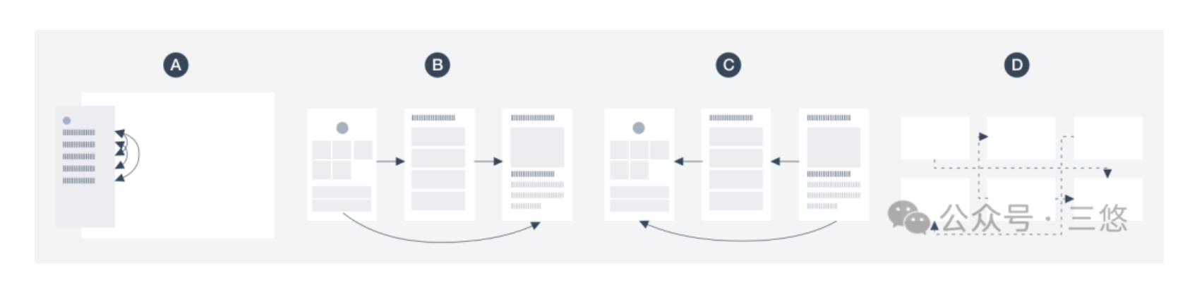 完善的導(dǎo)航體系應(yīng)支持四種核心路徑移動:同層級跳轉(zhuǎn)(平移)、進(jìn)入低層級內(nèi)容(下鉆)、返回歷史頁面或高層級(返回)、基于相關(guān)性推薦(聯(lián)想導(dǎo)航),四種路徑相互配合,覆蓋用戶的所有操作場景。