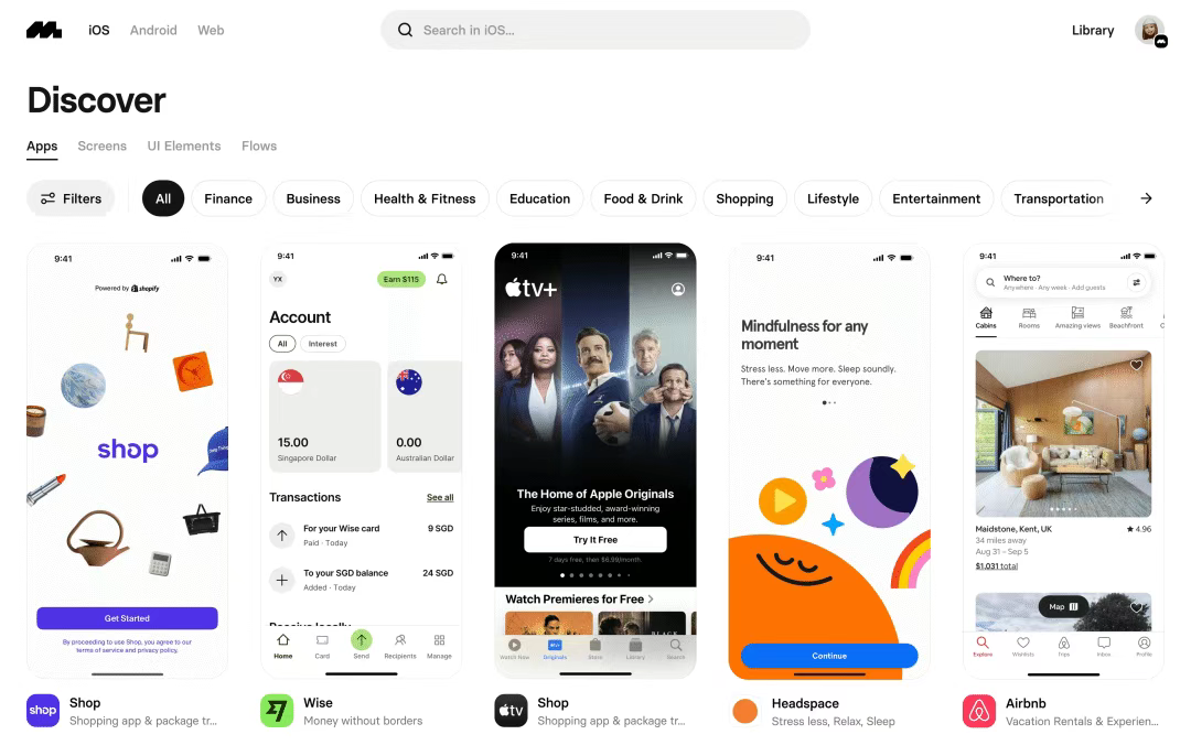 [Mobbin](http://mobbin.com) 是目前最大的UI/UX設(shè)計(jì)參考庫(kù)之一,提供了大量的移動(dòng)應(yīng)用和網(wǎng)站界面設(shè)計(jì)案例。與其他平臺(tái)不同,Mobbin 不僅展示首頁(yè)設(shè)計(jì),還提供完整的用戶流程和交互設(shè)計(jì)參考。