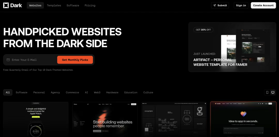 Dark Design 不僅提供整體網(wǎng)站設(shè)計(jì)靈感,還關(guān)注暗色模式下的細(xì)節(jié)處理,如色彩對(duì)比、可讀性和視覺(jué)層次,是設(shè)計(jì)暗色界面的絕佳參考資源。