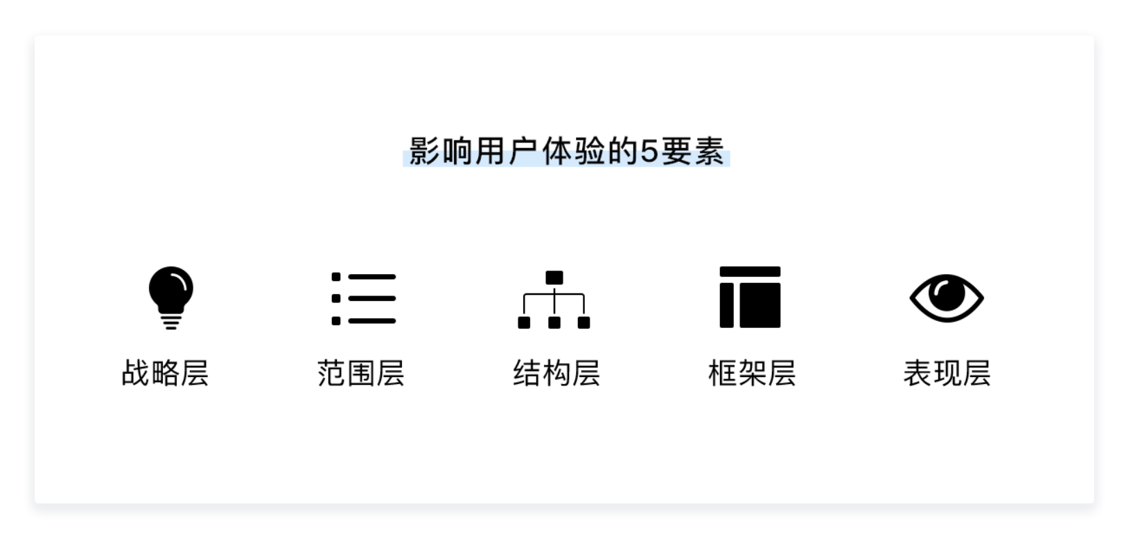無(wú)論 UX 設(shè)計(jì)的形式如何變化,其核心框架始終圍繞《用戶(hù)體驗(yàn)要素》提出的戰(zhàn)略層、范圍層、結(jié)構(gòu)層、框架層、表現(xiàn)層五個(gè)層級(jí)展開(kāi)。這五個(gè)層級(jí)從抽象到具體、從概念到落地,構(gòu)成了 UX 設(shè)計(jì)的完整邏輯體系,既是分析產(chǎn)品的工具,也是從 0 到 1 打造產(chǎn)品的核心方法論。