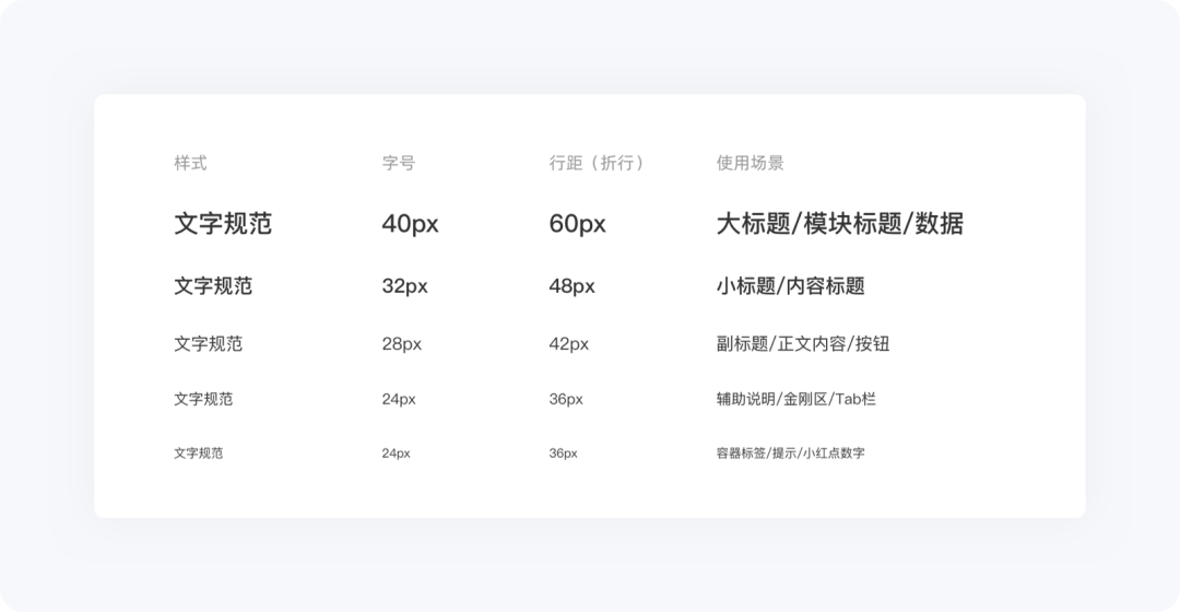 | 大標(biāo)題級(jí) | 40px | 60px | 模塊標(biāo)題、核心數(shù)據(jù)、頁(yè)面大標(biāo)題 |